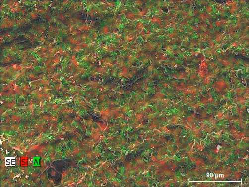 The ESD reveals another main difference between bodies A and B. The alumina (green color) is homogeneously dispersed on body A. On body B, the alumina crystals have a tendency to be agglomerated.