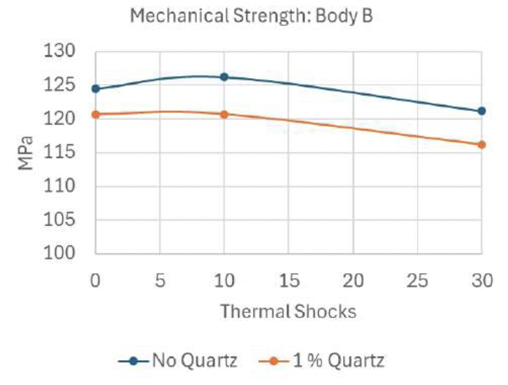With body B, we observe a smaller loss of mechanical strength with added quartz particles, at just 4 %. The 3 thermal shock tests failed, but the 10 and 30 shock tests confirm the same observation as with body A.