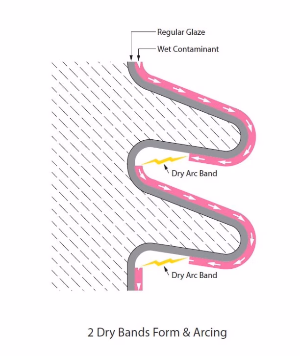 Finally, the controlled current in the glaze prevents dry band arcs and eliminates flashovers from occurring. The conductive properties of the glaze complete the circuit linking leakage current paths. When contamination on the surface of the insulator becomes wet, it becomes conductive, and leakage currents flow through it. RG® glaze is conductive and completes the “circuits” that are independent leakage current paths. This completed circuit allows for an even voltage distribution and prevents the initiation of dry band arcs. On non-semiconductive glaze units, repeated dry band arcs ionize the air along the insulator, leading to a flashover.